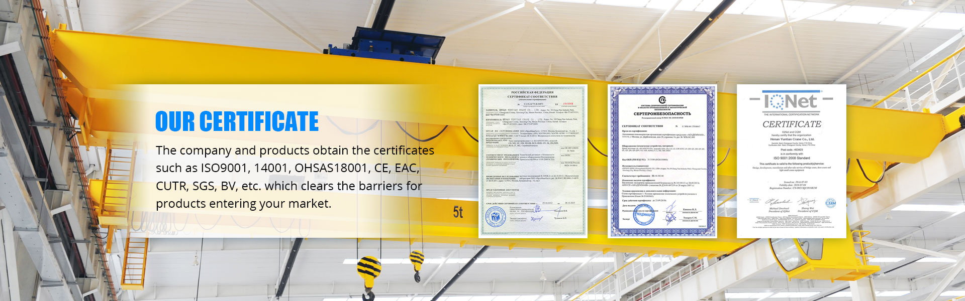 D'fhéadfaimis gach cineál craenacha tionscail a sholáthar duit ó 0.25tons go 900tons, pas GB / T 19001-2000 idt ISO 9001: 2000, GB / T 24001-2004 idt ISO 14001: 2004, GB / T 28001-2001, OHSAS 18001: 1999, CE, GOST, SGS, TUV, BV agus mar sin de.